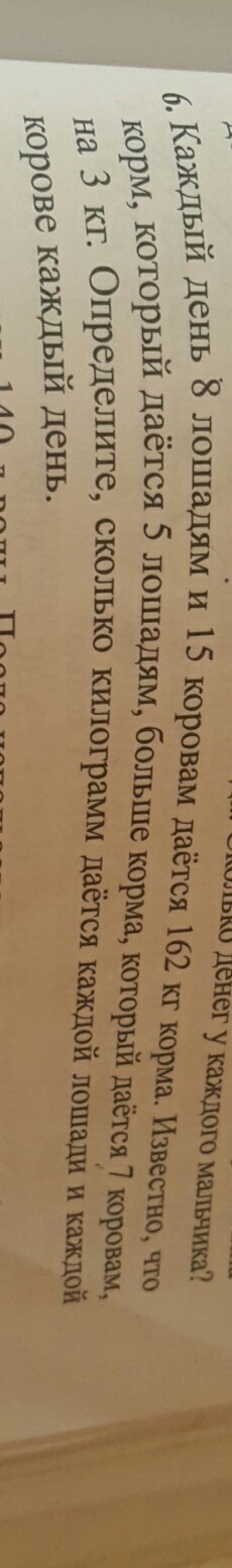 каждый день 8 лошадей и 15 коров вам дается 162 кг корма известно что Корм которые даются в 5 лошадям больше корму который дается 7 коровам на 3 кг. Определите сколько килограмм дает за каждой лошади и Каждый корове каждый день
