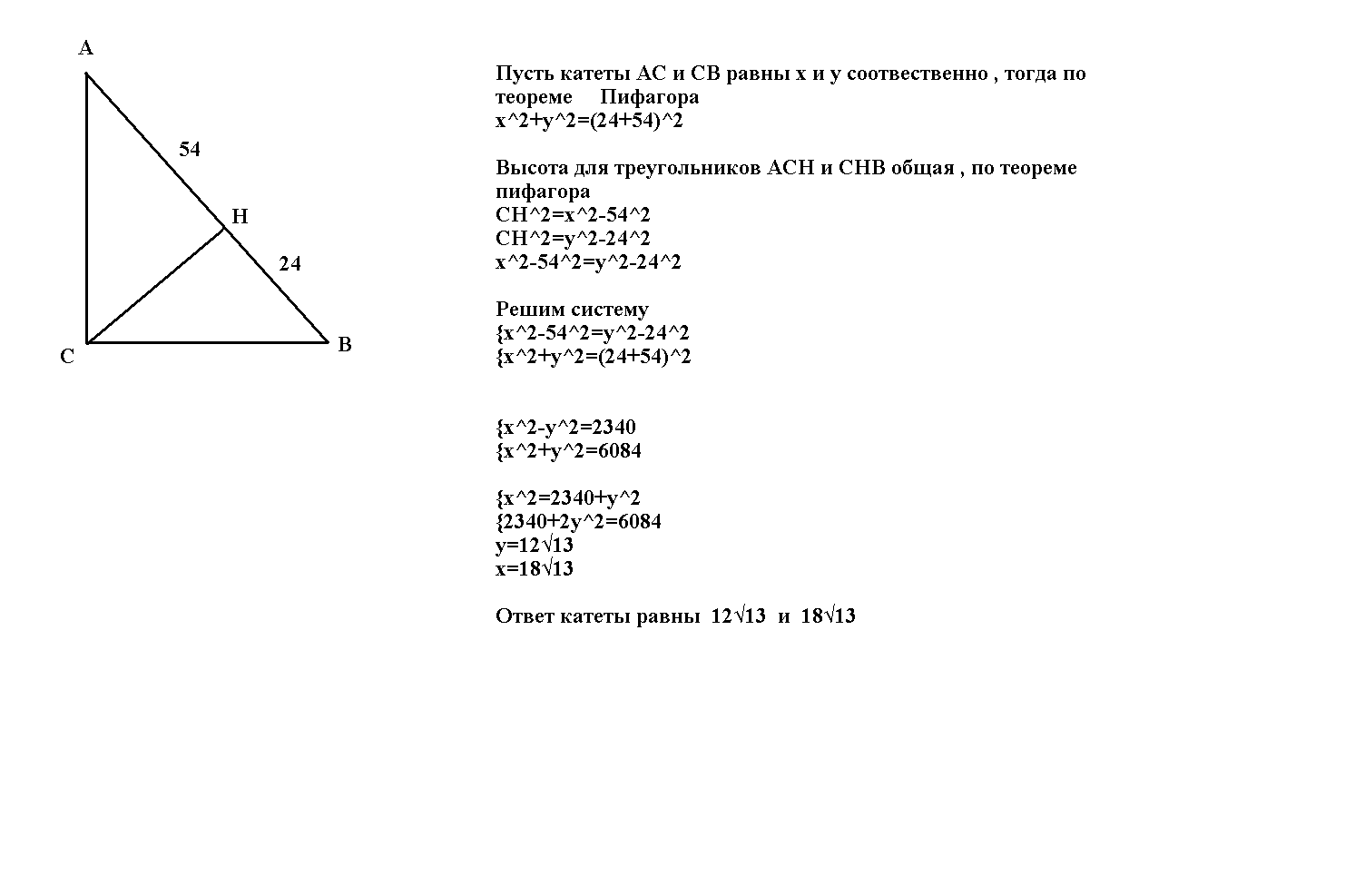 Высота ,проведенная к гипотенузе прямоугольного треуг,делит гипотенузу на отрезки ,равные 24 и 54.Найдите катеты этого треуг (если можно подробно)