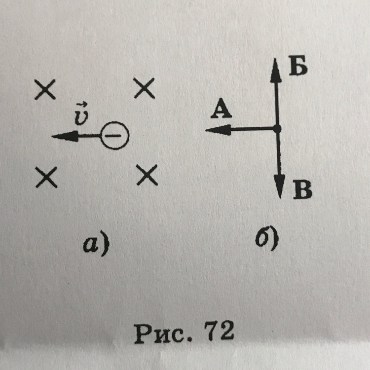 На рисунке 72,a изображена отрицательно заряженна частица, движущаяся со скоростью v в магнитном поле. Какой вектор на рисунке 72, б указывает направление силы, с которой поле действует на частицу?