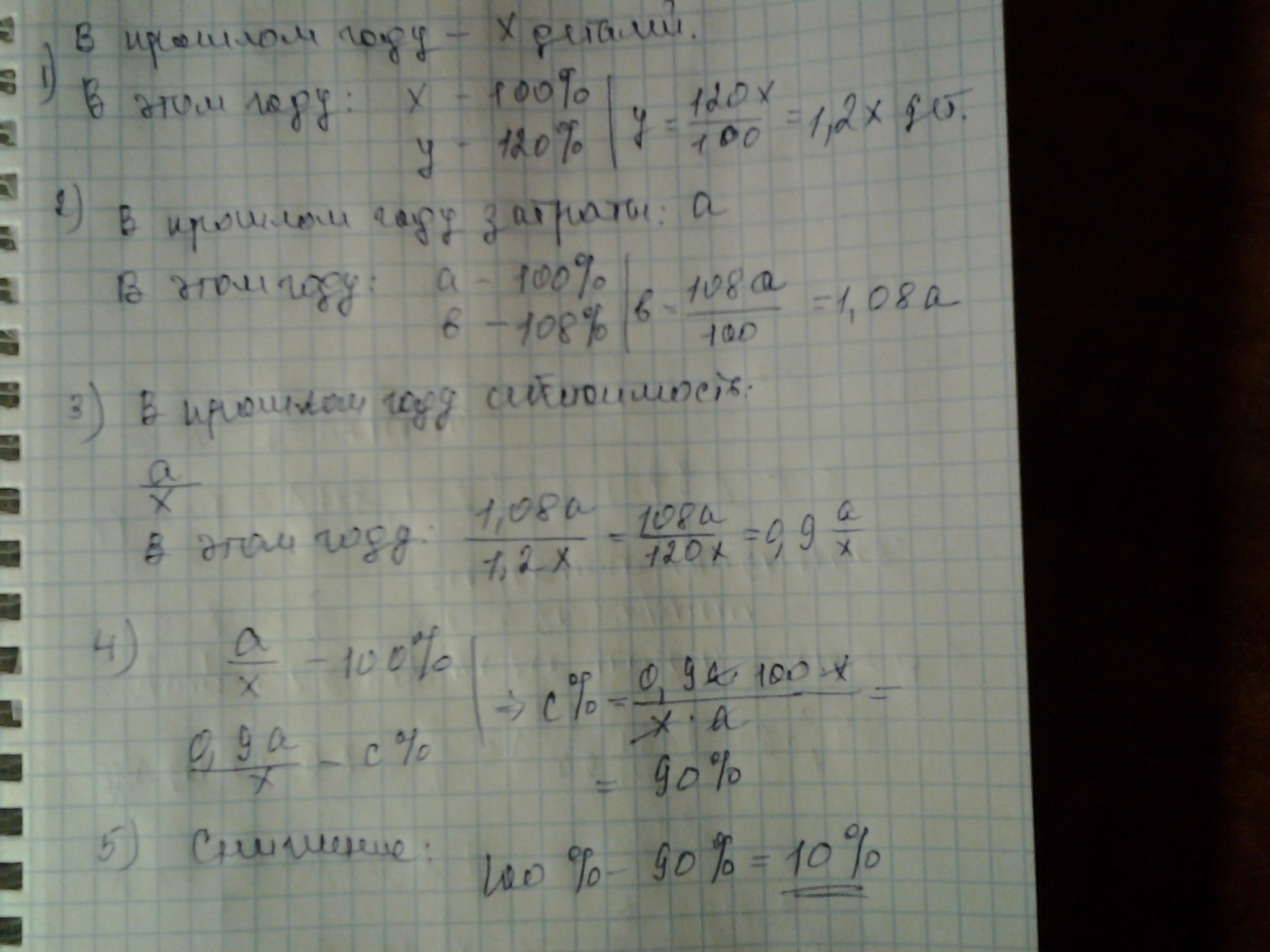 завод в этом году произвел на 20% больше изделий, чем в прошлом, а затраты на производство за этот же период повысились на 8%. На сколько % понизилась себестоимость 1го изделия?