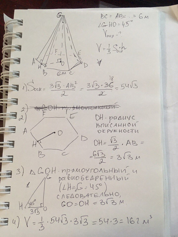Сторона основания правильной шестиугольной пирамиды равна 6 м, а двугранный угол при ребре основания равен 4 градусов. Найдите объём пирамиды.