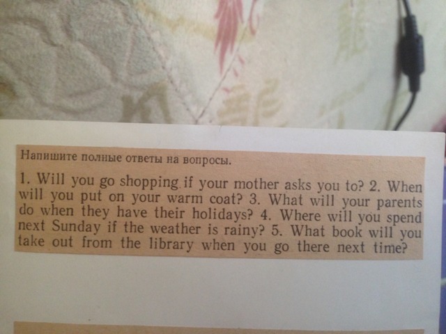 1)Yes, I will go for shopping if my mom will ask me 2)I will put on a warm coat if weather is cold 3)My parents will spend holidays with me 4)If the weather will be rainy next Sunday, i will spend this day home 5)The next rime if i go to the library i will take Sholohov "Tikhiy Don"