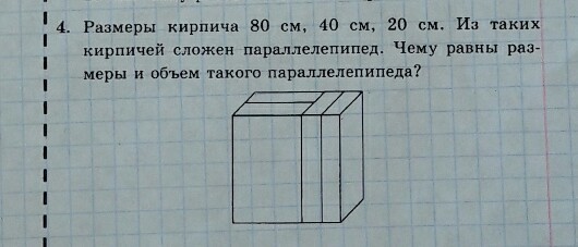 размеры кирпича 80 см 40 см 20 см из таких кирпичей сложен параллелепипед чему равны размеры и объем этого параллелепипеда