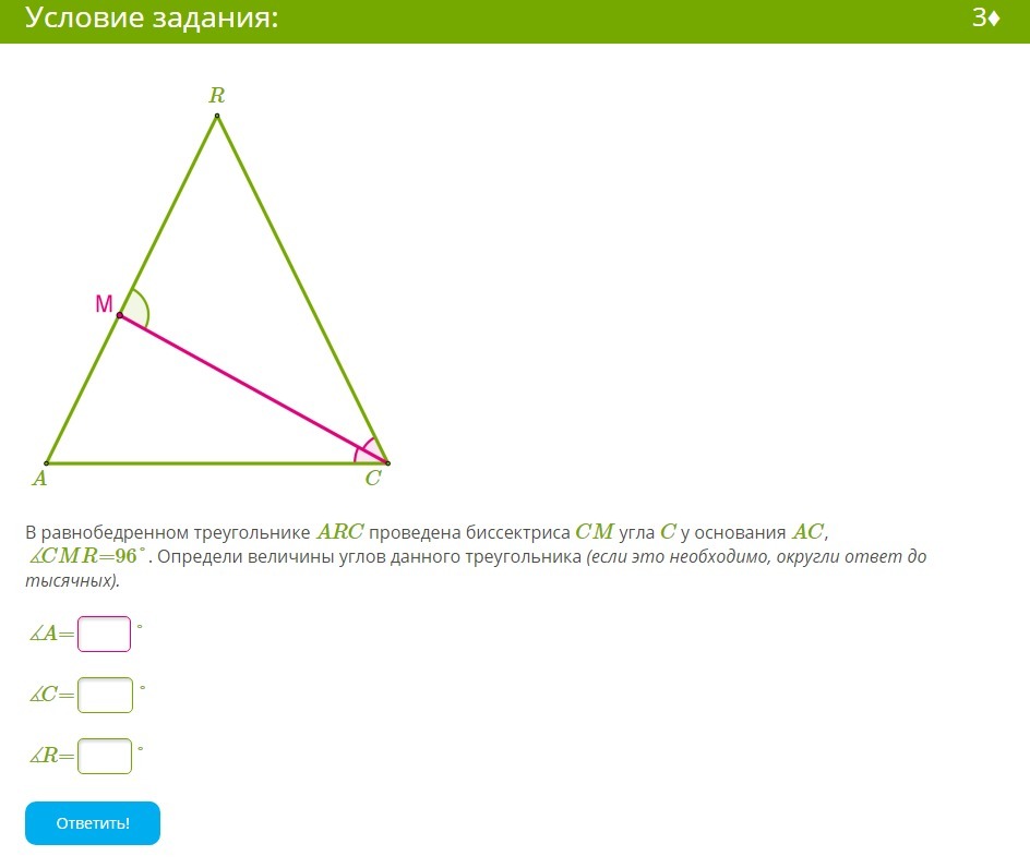 Ответ: ∠А=64°, ∠С=64°, ∠R=52°.