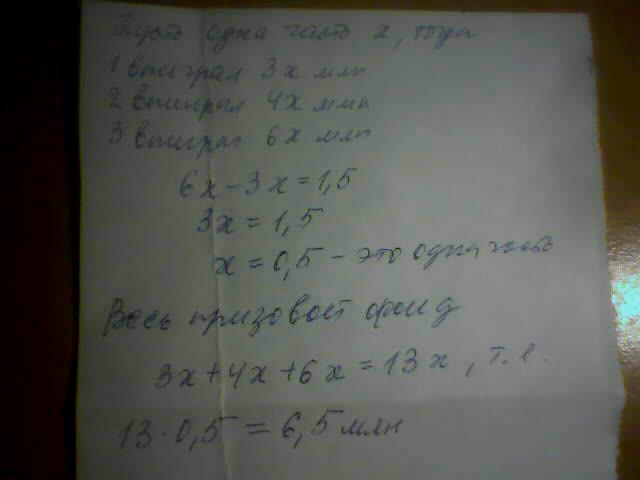 Трое счастливцев выиграли в лотерею сумму, относящиеся друг к другу как 3:4:6.Если разность между наибольшем и наименьшем выигрышем составляет 1,5 миллиона рублей, то чему равен весь призовой фонд лотерии в данном розыгрыше?Сумму укажите в миллионах.