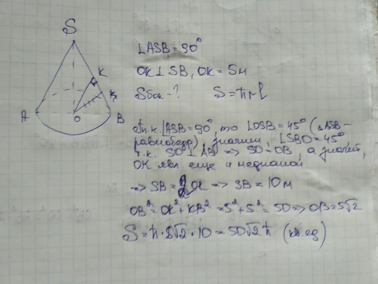 осевым сечением конуса является прямоугольный треугольник. расстояние от центра основание конуса до его образующей равно 5 м. вычислить площадь боковой поверхности конуса