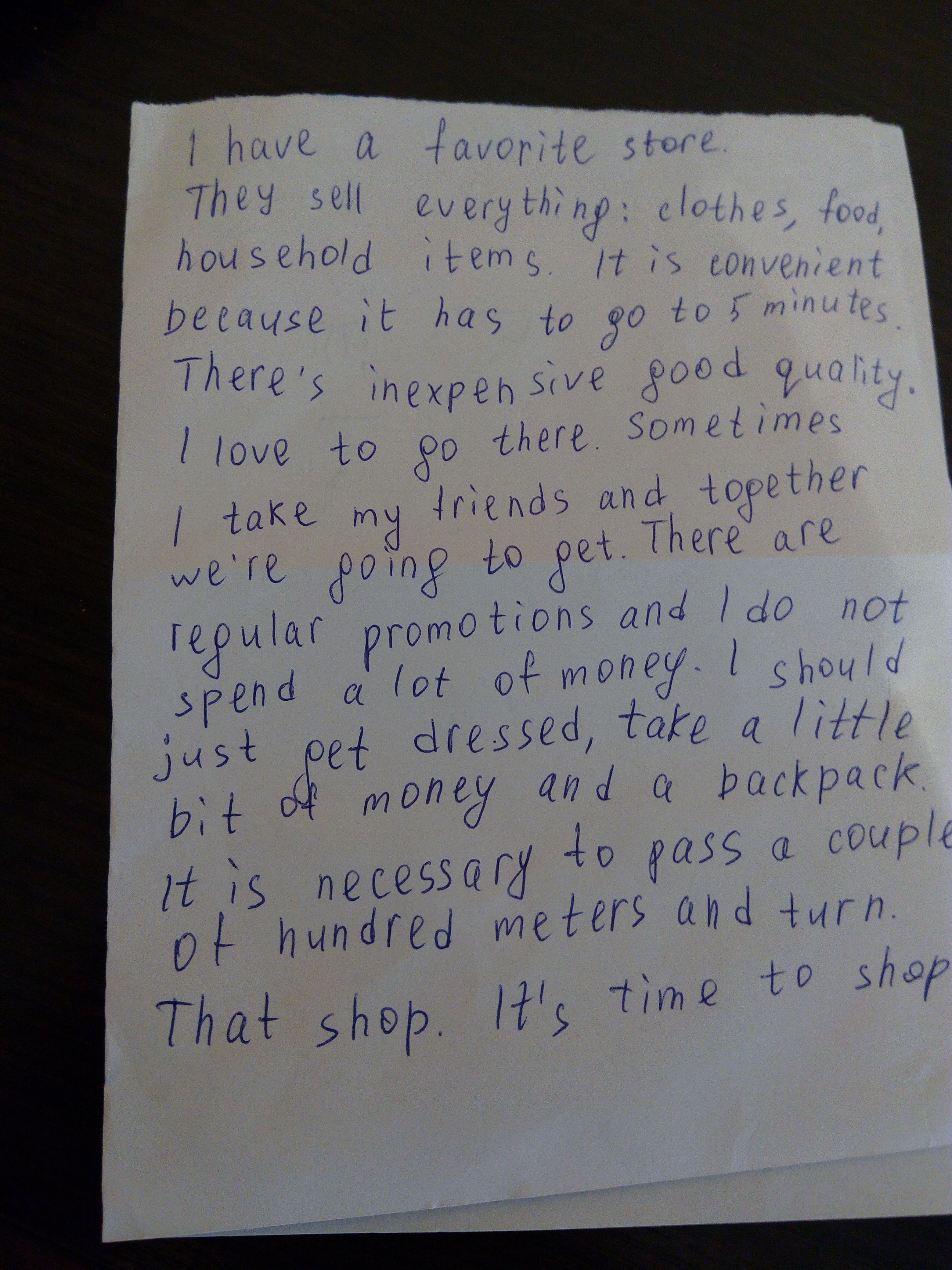 У меня есть любимый магазин. Там продается все: одежду, еду, хозяйственные товары. Он удобный, потому что он находится в 5 минутах ходьбы от моего дома. Там недорогие товары хорошего качества. Мне нравится туда ходить. Иногда я беру с собой друзей и вместе мы идем туда. Там всегда проходят акции и я не трачу много денег. Мне нужно только одеться, взять немного денег и рюкзак. Необходимо пройти несколько сотен метров и повернуть. Вот магазин. Время идти за покупками!