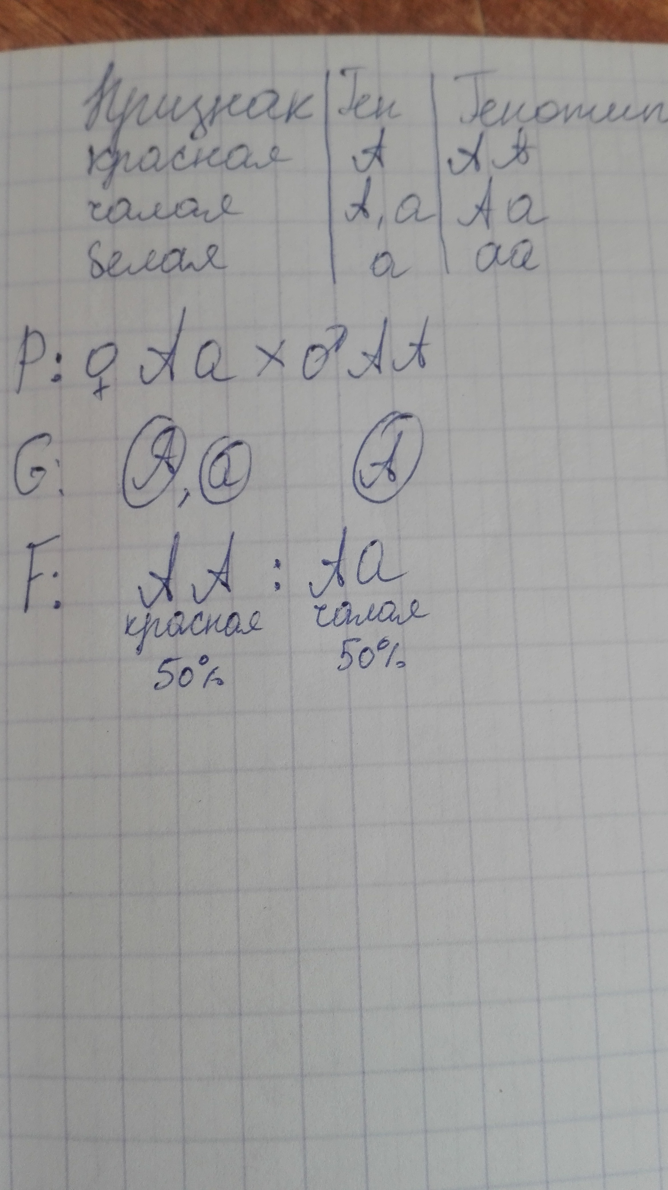 У крупного рогатого скота породы шортгорн красная масть не полностью доминирует над белой мастью, и потомство получается чалым. Какой масти потомство следует ожидать от скрещивания чалой коровы с красным быком?