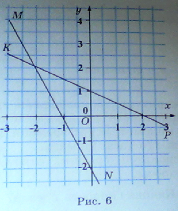 Графиком первого уравнения является прямая MN, а графиком второго уравнения - прямая KP (рис. 6): 1) составьте систему уравнений; 2) найдите решение системы уравнений и докажите, что оно единственное.