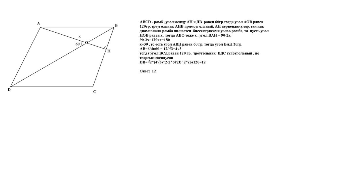 из вершины тупого угла ромба проведен перпендикуляр к стороне. этот перпендикуляр пересекает диагональ под углом в 60 градусов. найдите длину этой диагонали, если длина перпендикуляра равна 6 см.