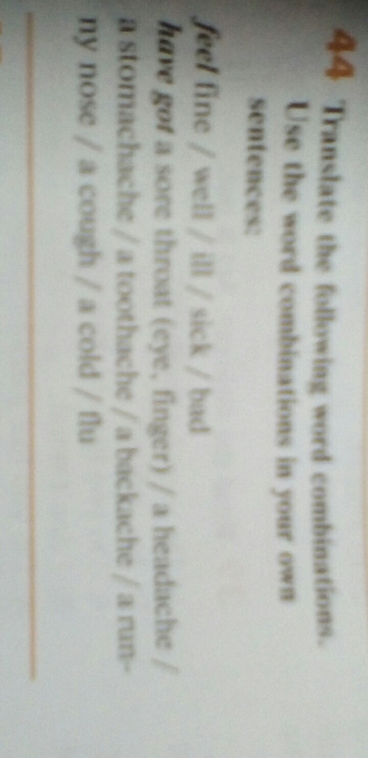 Составьте 3-4 предложения со словами: feel fine /well/ill/sick/bad have got:a sore throat (eye,finger)/ a headache /a stomachache/ a toothache/a backache /a runy nose /a cough /flu