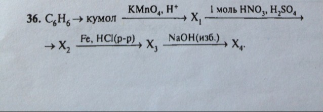 2) 5C6H5-CH(CH3)2 + 18KMnO4 + 27H2SO4 = 5C6H5-COOH (X1 - бензойная к-та) + 10CO2 + 18MnSO4 + 9K2SO4 + 42H2O;