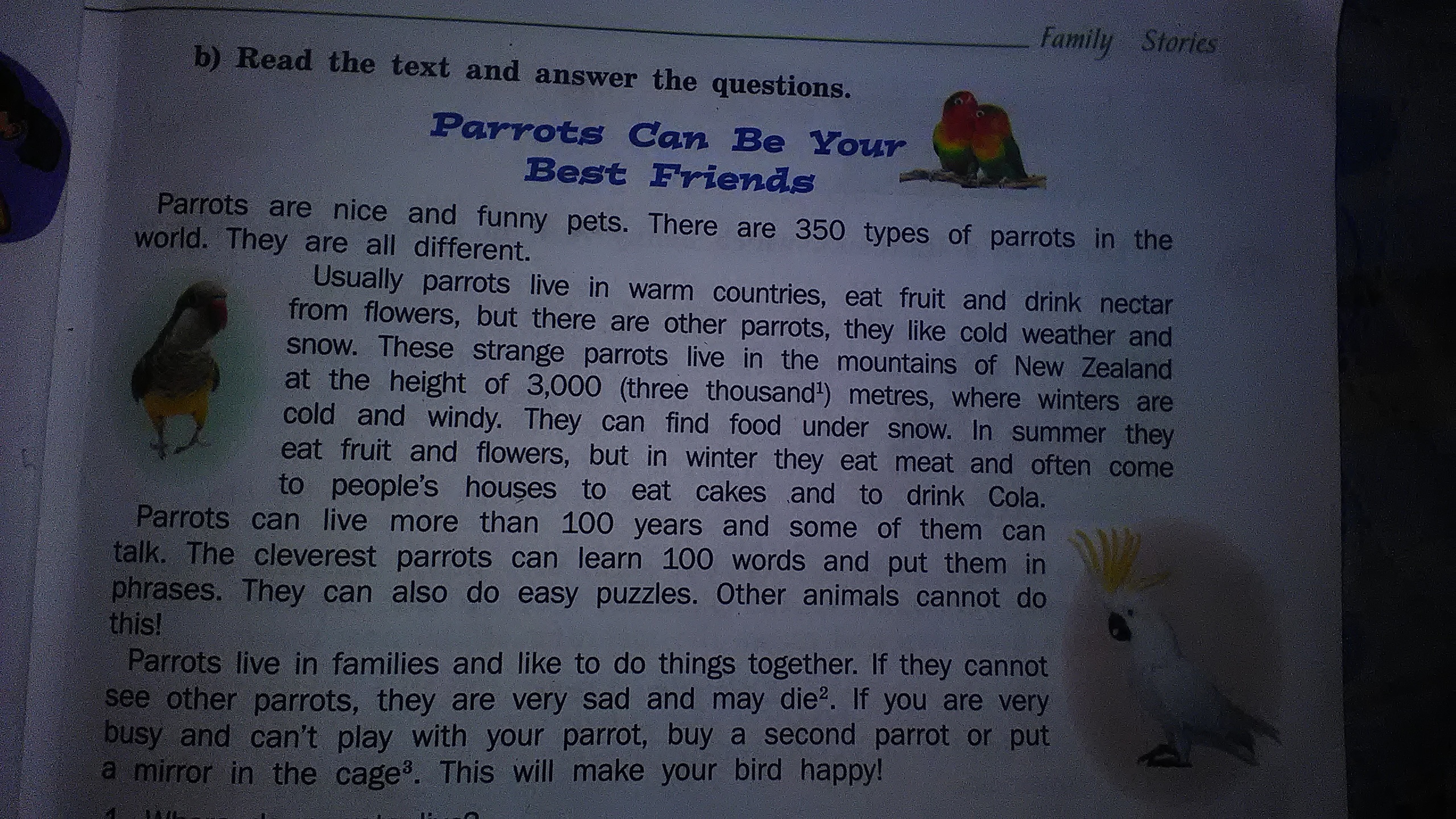 Попугаи могут быть вашими лучшими друзьями Попугаи хорошие и забавные домашние животные. В мире насчитывается 350 видов попугаев. Они все разные. Обычно попугаи живут в теплых странах, едят фрукты и пьют нектар с цветов, но есть и другие попугаи, они любят холодную погоду и снег. Эти странные попугаи живут в горах Новой Зеландии на высоте 3000 (три тысячи) метров, где зима холодная и ветреная. Они могут найти еду под снегом. Летом они едят фрукты и цветы, а зимой едят мясо и часто приходят в дома людей, чтобы есть пирожные и пить Колу. Попугаи могут жить более 100 лет, и некоторые из них могут говорить. Самые умные попугаи могут выучить 100 слов и поместить их во фразы. Они также могут делать простые головоломки. Другие животные не могут этого сделать! Попугаи живут в семьях и любят делать что-то вместе. Если они не видят других попугаев, они очень грустны и могут умереть2. Если вы очень заняты и не можете играть с попугаем, купите второго попугая или положите