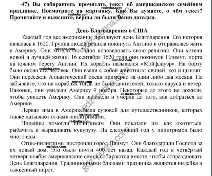 Первая зима в Америке была суровой для путешественников, которых назвали пилигримами. Индейцы пнаучили полигримов охотиться, рыбачить и выращивать кукурузу. На следующий год у пилигримов было много еды. Они благодарили Господа за их новый дом.