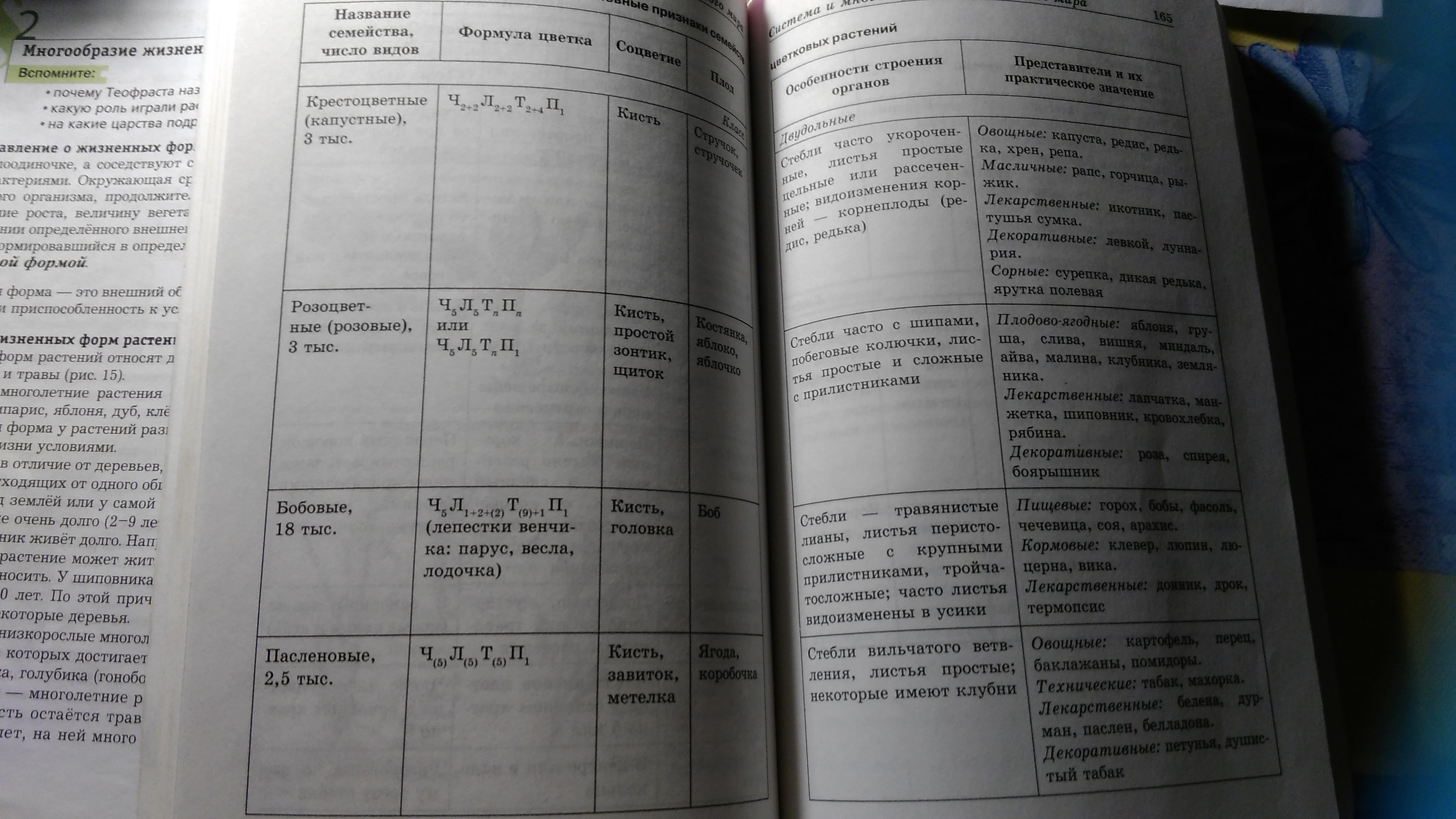 признаки Крестоцветных, паслёновых, астровых, сложноцветных.