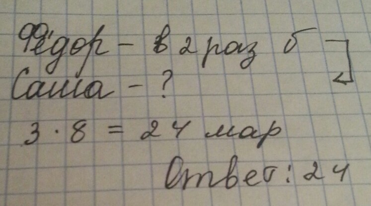 У Фёдора в 2 раза больше марок чем у Саши. Когда Фёдору подарили ещё 8 марок, то у него их стало в 3 раза больше, чем у Саши. Сколько марок было у Саши. Нарисовать схему к задаче.