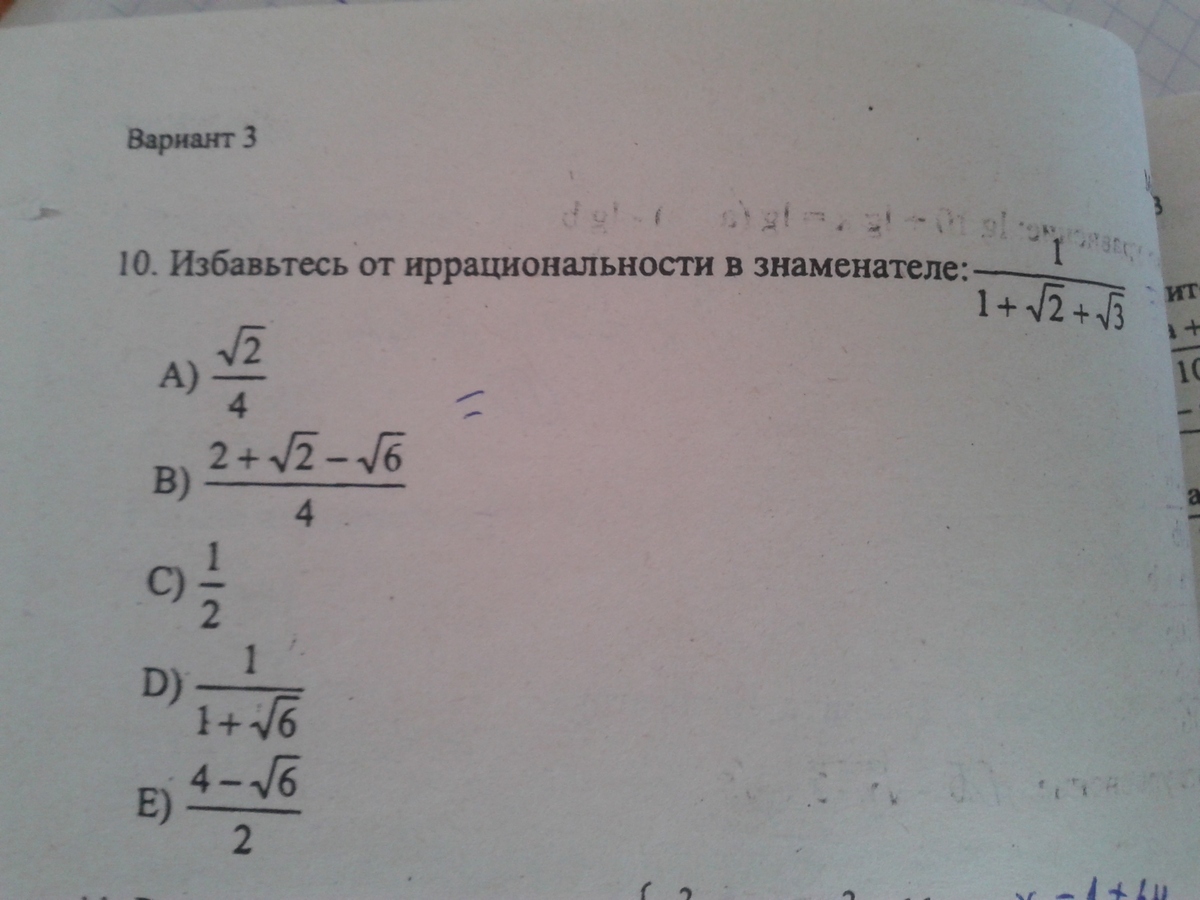 (1+sqrt(2)-sqrt(3))/2sqrt(2)=(sqrt(2)+2-sqrt(6))/4 ответ B)