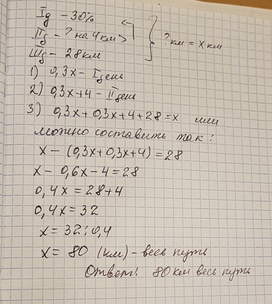 Туристы прошли намеченный маршрут за 3 дня.В первый день они прошли 30% намеченного маршрута, во второй - на 4 км больше , чем в первый, а в третий оставшиеся 28 км.Какова длина маршрута?