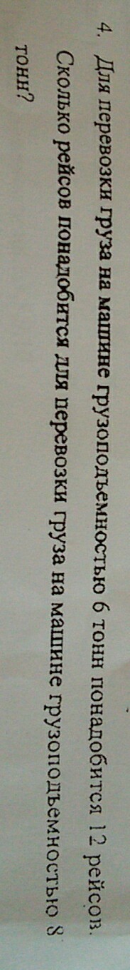 две перевозки груза на машине грузоподьемностью 6 тонн понадобится 12 рейсов. сколько рейсов понадобится для перевозки груза на машине грузоподьемностью 8 тонн?