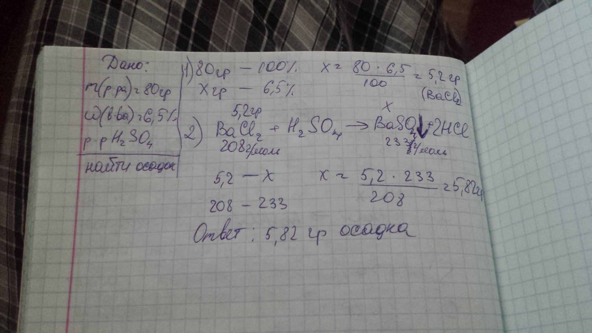 К 80 г раствора хлорида бария с массовой долей растворённого вещества 6,5% добавили избыток раствора серной кислоты. Вычислите массу выпавшего осадка.