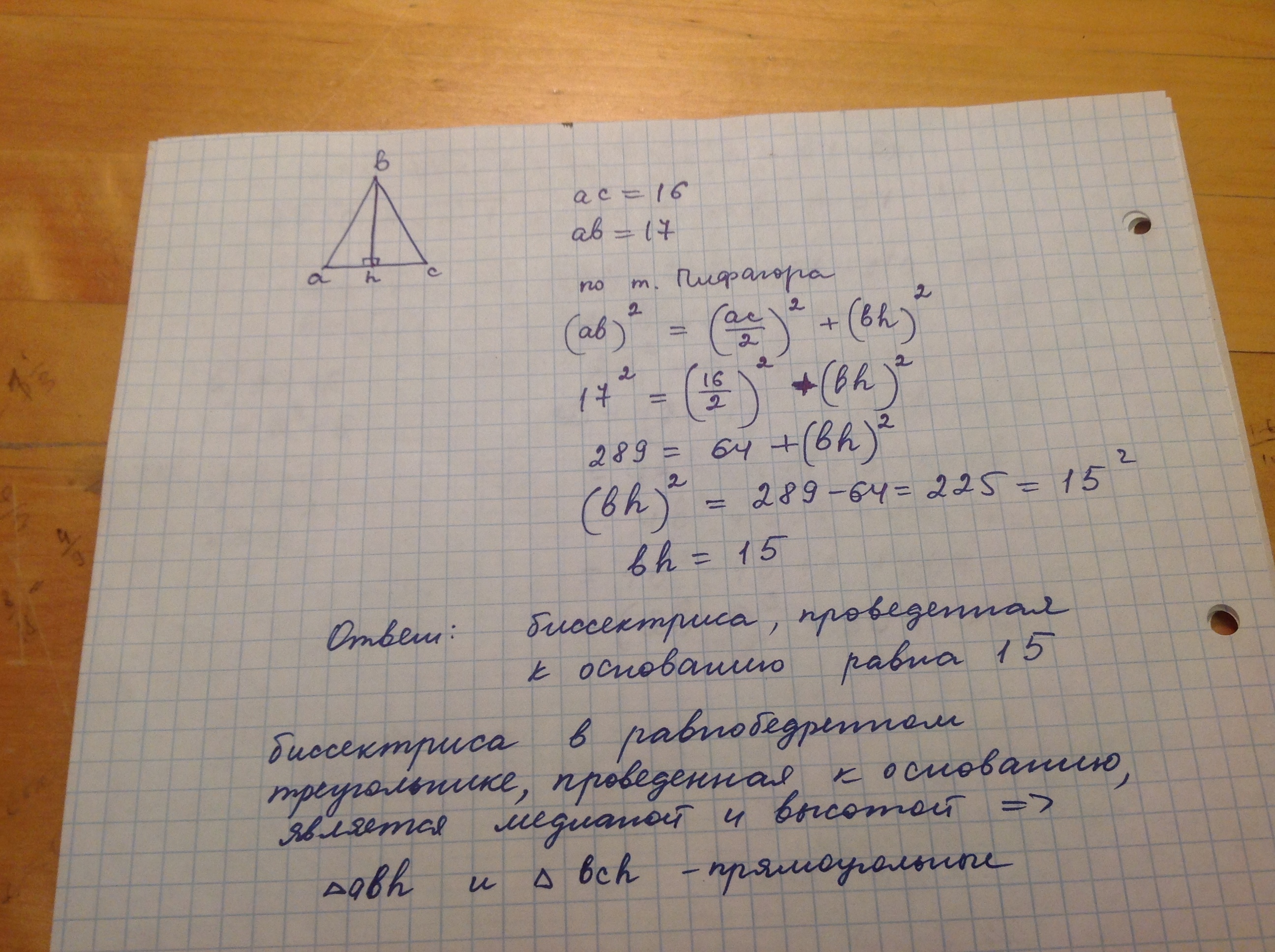 В равнобедренном треугольнике авс основание, ас равно 16 ,ab равно 17 Найти длину биссектрисы проведенной к основанию