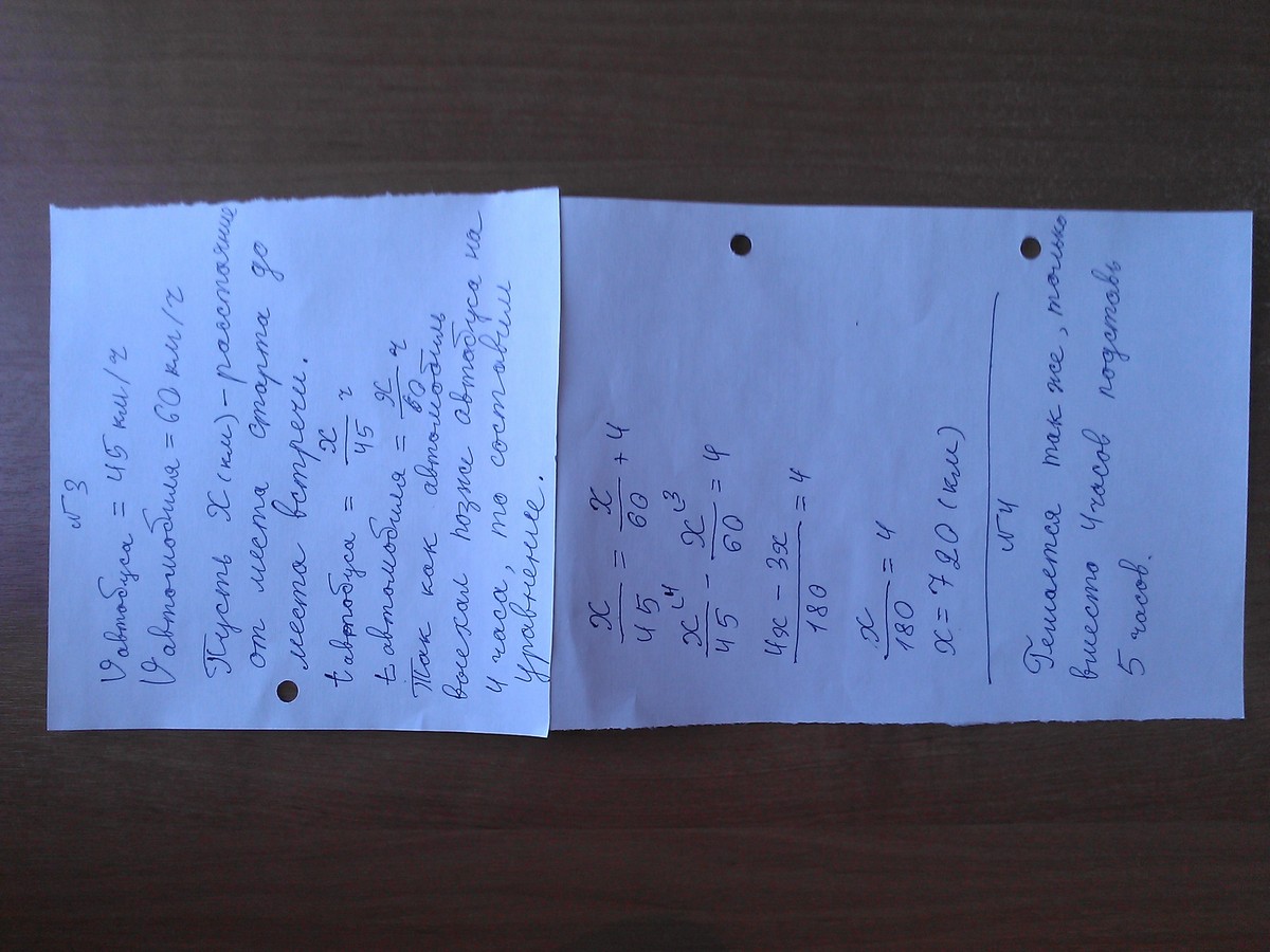 3 задание:из города выехал автобус со скоростью 45км/ч ,а через 4часа вслед за ним выехал автомобиль со скоростью 60км/ч .через сколько часов после своего выезда автомобиль догонит автобус .