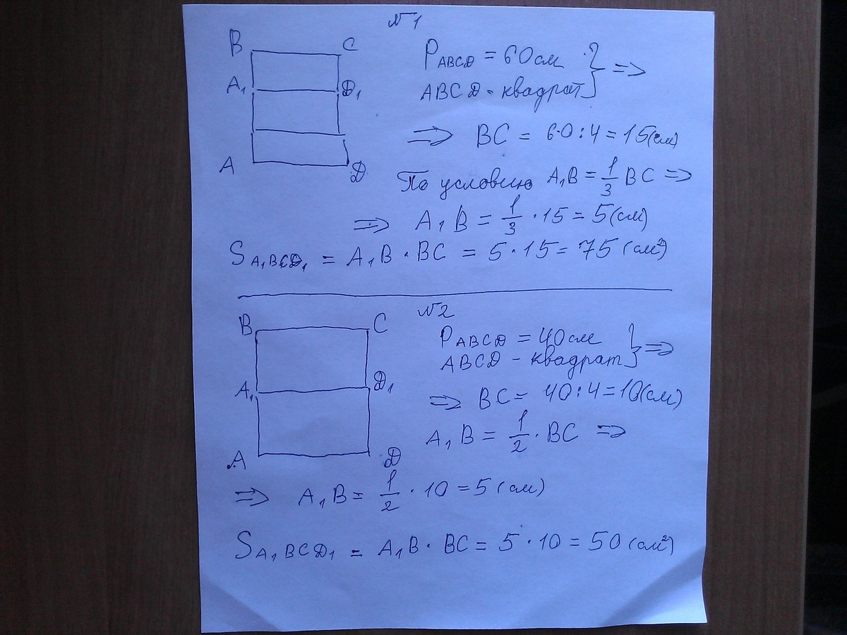 1задание:одна из сторон прямоугольника второе больше другой.три таких прямоугольника составили сторонами так,что получился квадрат .периметр получившегося квадрата равен 60см.найдите площадь прямоугольника .