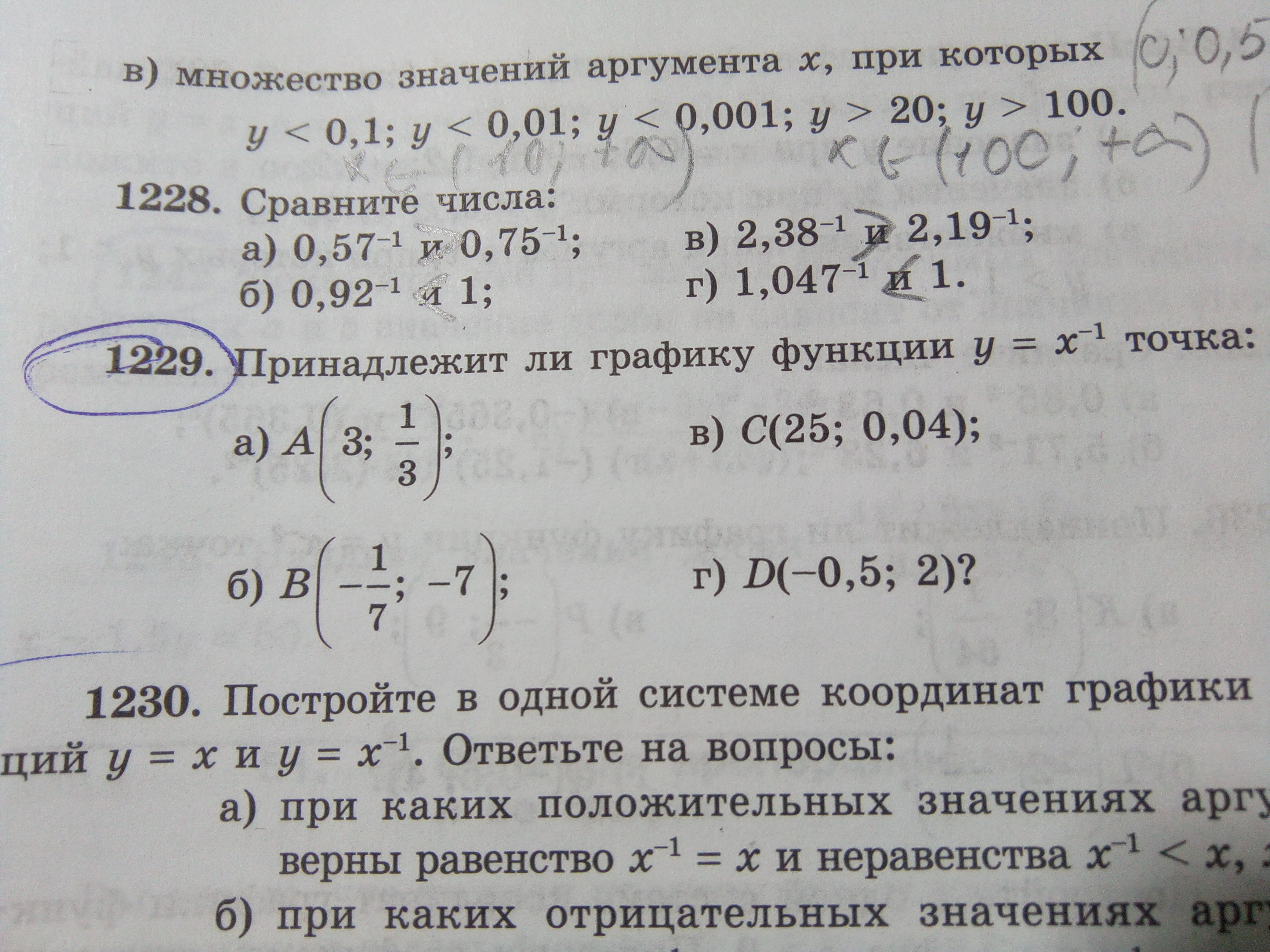 Здесь нужно просто подставить первую координату каждой из 4-х скобок в уравнение: у=х^-1 и полученное сравнить со второй координатой из той же скобки.