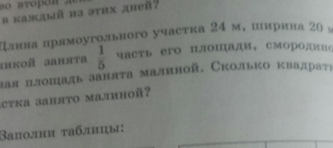 длина прямоугольного участка 24 м. ,ширина 20м. Клубникой занята 1/5 часть его площади ,смородиной 1/4 , остальная площадь занята малиной Сколько метров квадратных занято малиной?