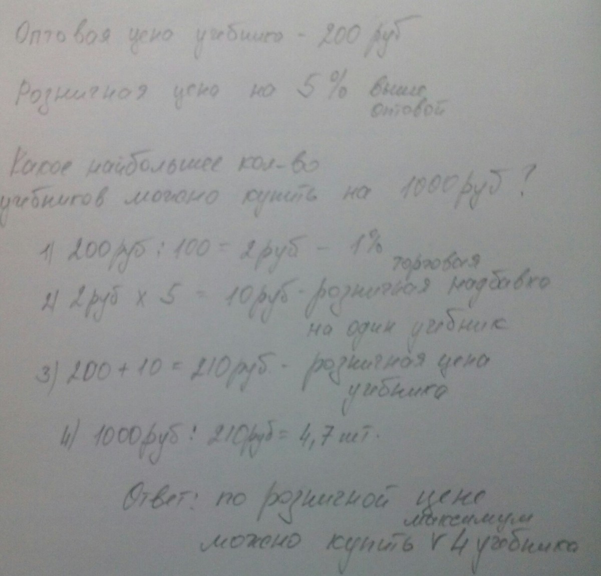 Оптовая цена учебника 200 рублей.Розничная цена на 5% выше оптовой.Какое наибольшее число учебников можно купить по розничной цене на сумму 1000 рублей.