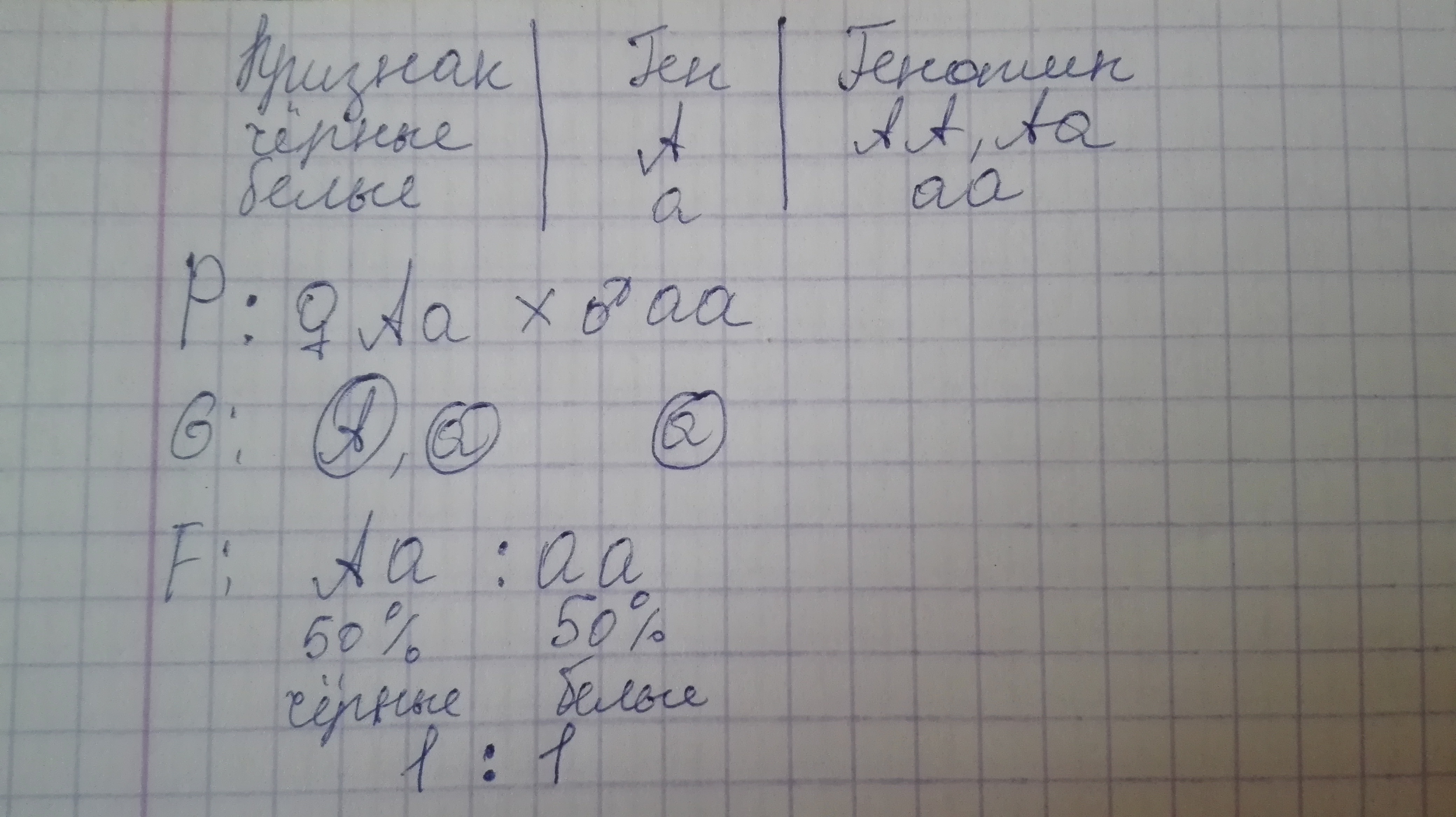 У морских свинок ген чёрной окраски доминирует над геном белой окраски. Определите соотношение фенотипов у потомков, полученных в результате скрещивания гетерозиготной самки и белого самца. Ответ запишите в виде последовательности цифр, показывающих соотношение получившихся фенотипов.