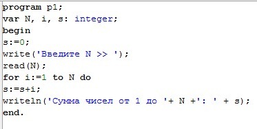 program p1;var N, i, s: integer;begins:=0;write('Введите N >> ');read(N);for i:=1 to N dos:=s+i;writeln('Сумма чисел от 1 до '+ N +': ' + s);end.