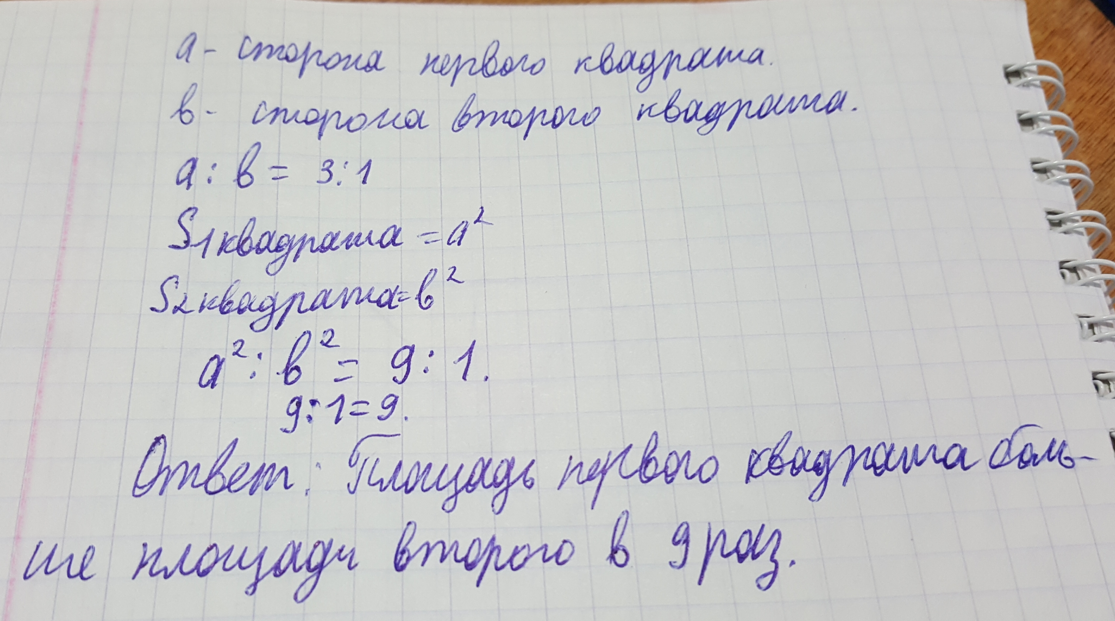 Ничего не понимаю но вот задача: Сторона квадрата (3:1 в виде дроби)стороны другого квадрата. Во сколько раз отличаются их площадью???