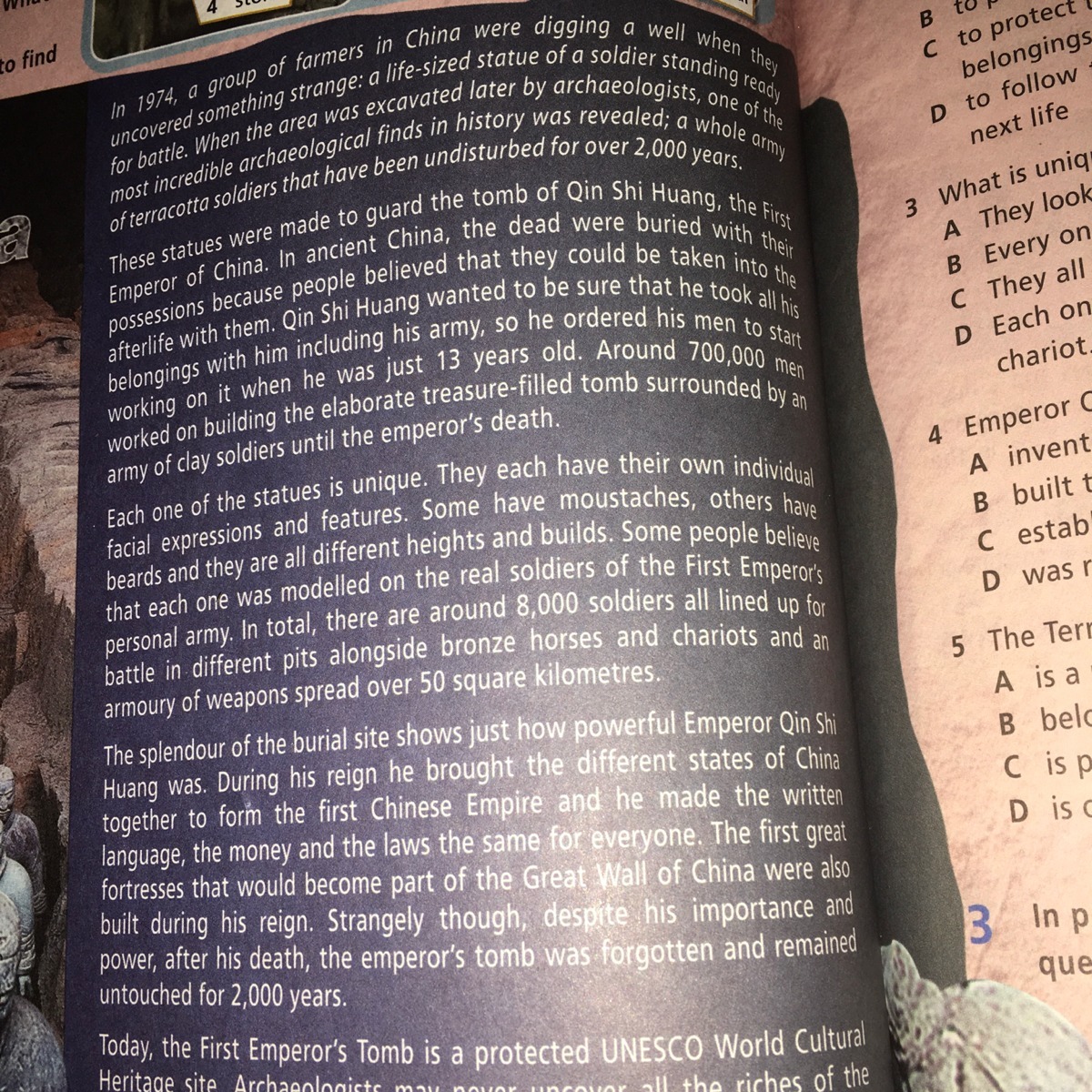 Странных: позже археологи обнаружили Алифе-си и обнаружили что-то в истории. Выявлено; В целом для Когда более 2000 невероятных археологических раскопок было найдено за годы терракоты Солдат могила oi похоронен с t Эти статуи были сделаны, чтобы охранять мертвых, были взяты th In Древний Китай, могли быть владениями, потому что люди полагали, что это будет сделано в Цинь Хуан Хотел заказать его с ним, включая его армию, поэтому он работает, когда ему всего 13 лет. Около 700 000 гробниц при строительстве тщательно продуманной армии смерти глиняных солдат до императорской Каждая из статуй уникальна. У каждого из них свои особенности и черты лица. Некоторые из них Бороды, и они разные высоты и строит. Некоторые люди считают, что каждый из них был смоделирован Настоящие солдаты Первой личной армии. В общей сложности насчитывается около 8000 солдат, выстроившихся и Сражение в разных ямах вместе с бронзовыми лошадьми и чарами с оружием более 50 квадратные километры. Великолепие захоронения показывает только могущественного императора Цинь Ши Хуанга был. Во время его правления он привел различные государства Китая вместе, чтобы сформировать первый китайский Империя и он сделали письменный язык, деньги и законы одинаковыми для всех. Первый Grea fortresses, которые стали частью Великой китайской стены, также были построены во время его правления. Как ни странно, его значимость и сила после его смерти, гробница императора была забыта И остался нетронутым в течение 2000 лет. Сегодня гробница первых императоров является охраняемым миром UNESCo Cultua hes из наследия sita Arrhaan ma.