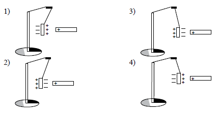 К незаряженной легкой металлической гильзе, подвешенной на шелковой нити, поднесли, не касаясь, положительно заряженную стеклянную палочку. На каком рисунке правильно показано поведение гильзы и распределение зарядов на ней?
