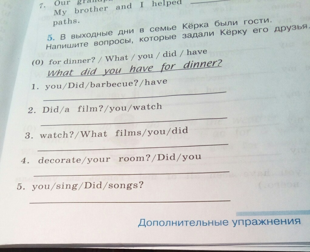 В выходные дни в семье Кёрка были гости. Напишите вопросы которые задали Кёрку его друзья.