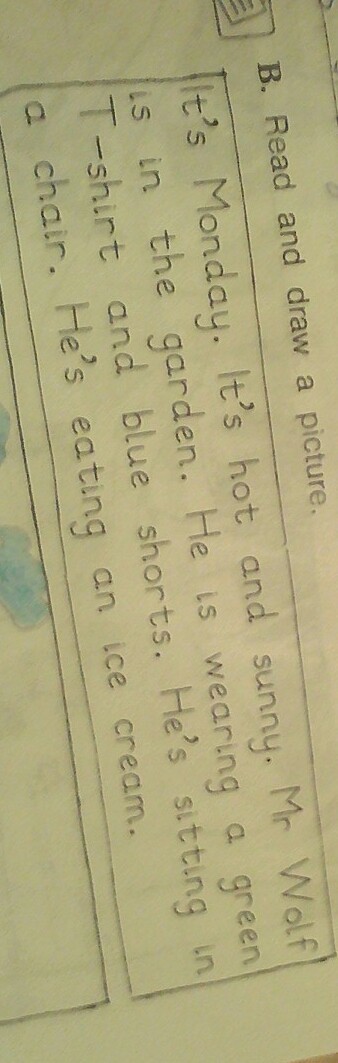 Это понедельник.Он жаркий и солнечный.Мистер волк в саду.Он носит зелёную футболку и синие шорты.Он сидит на стуле.Он ест мороженое.