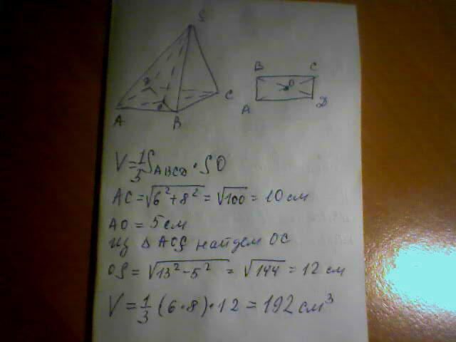 Основание пирамиды-прямоугольник со сторонами 6 и 8.Найдите объем пирамиды,если все ее боковые ребра равны 13.в ответе должно получится 192.помогите пжл.