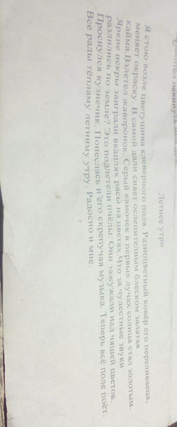 Я стою возле цветущего,клеверного поля.Разноцветный ковёр его переливается,меняет окраску.В самой дали сияет ослепительным блеском золотая кайма.Взлетел жаворонок. Серый комочек в лучах солнца стал золотым.Яркие искры заиграли в каплях росы на цветах. Что за чудесные звуки разлились по земле?Это подлетели пчёлы. Они зажужжали над чащей цветов.Проснулся кузнечик.Понеслась и его скрипучая музыка.Теперь всё поле поёт.Все рады тёплому летнему утру. Радостно и мне.
