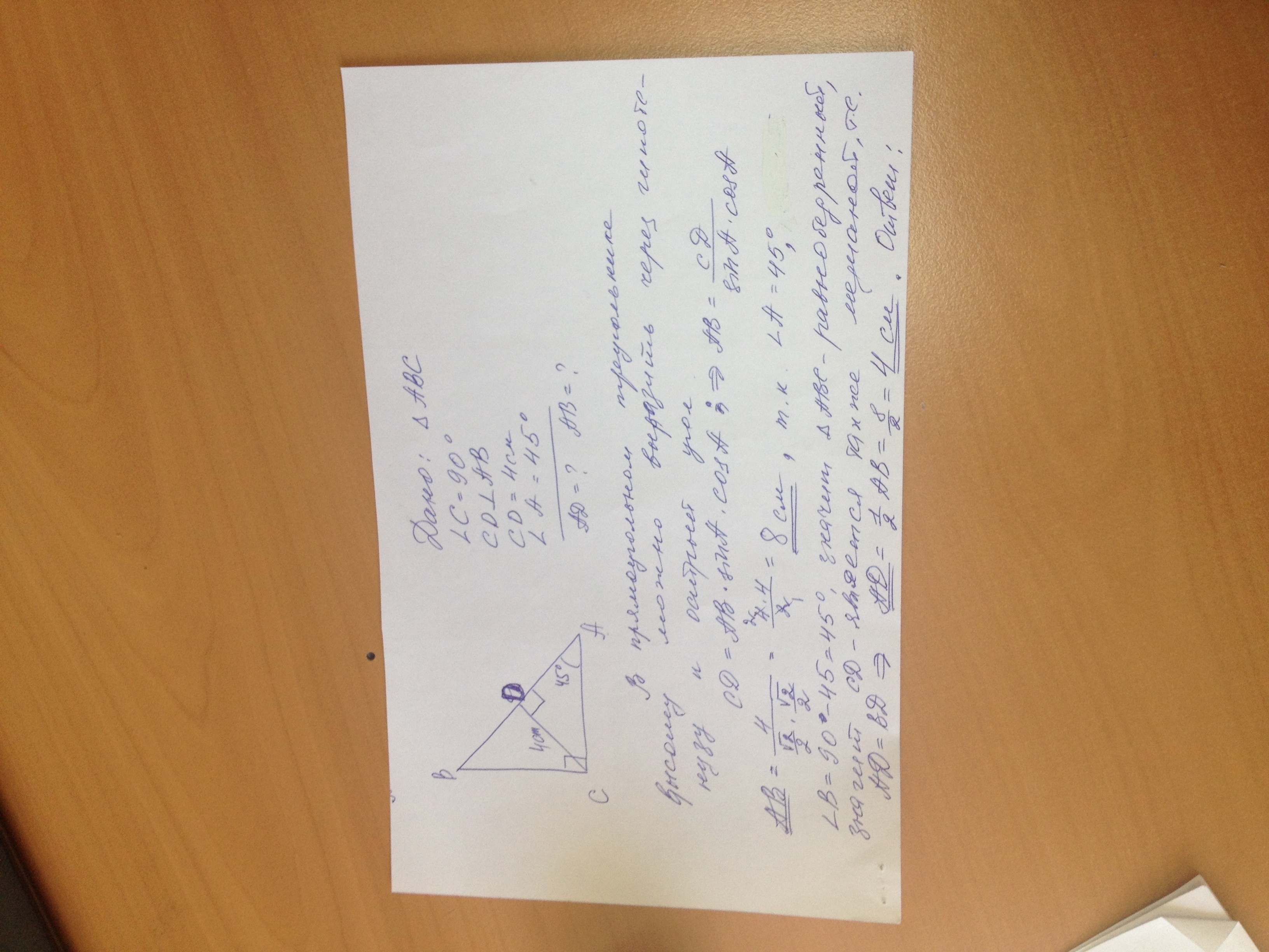 3) т.к. медиана прямоугольного треугольника, проведенная из вершины прямого угла, равна половине гипотенузы, то АД=4, АВ=8.