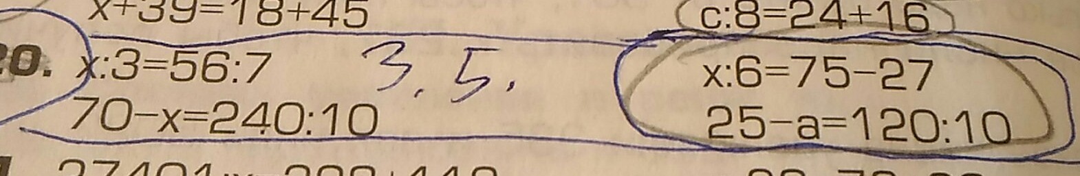 решите уравнения x:3=56:7. 70-x=240:10. x:6=75-27. 25-а=120:10