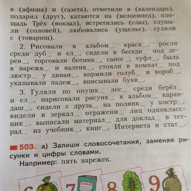 сидели в беседках (П.п.) под деревьями (Тв.п.), сидели с друзьями (Тв.п.) на полянках (П.п.) у костров (Р.п.), торговали ботинками(Тв.п.), сапогами(Тв.п.), туфлями (Тв.п.), была в варежках (П.п.) и в валенках (П.п.), стояли в комнатах (П.п.) под люстрами (Тв.п.) у диванов (Р.п.), кормили голубей (В.п.) и воробьев (В.п.), указывали падежи (В.п.), выписывали буквы (В.п.)