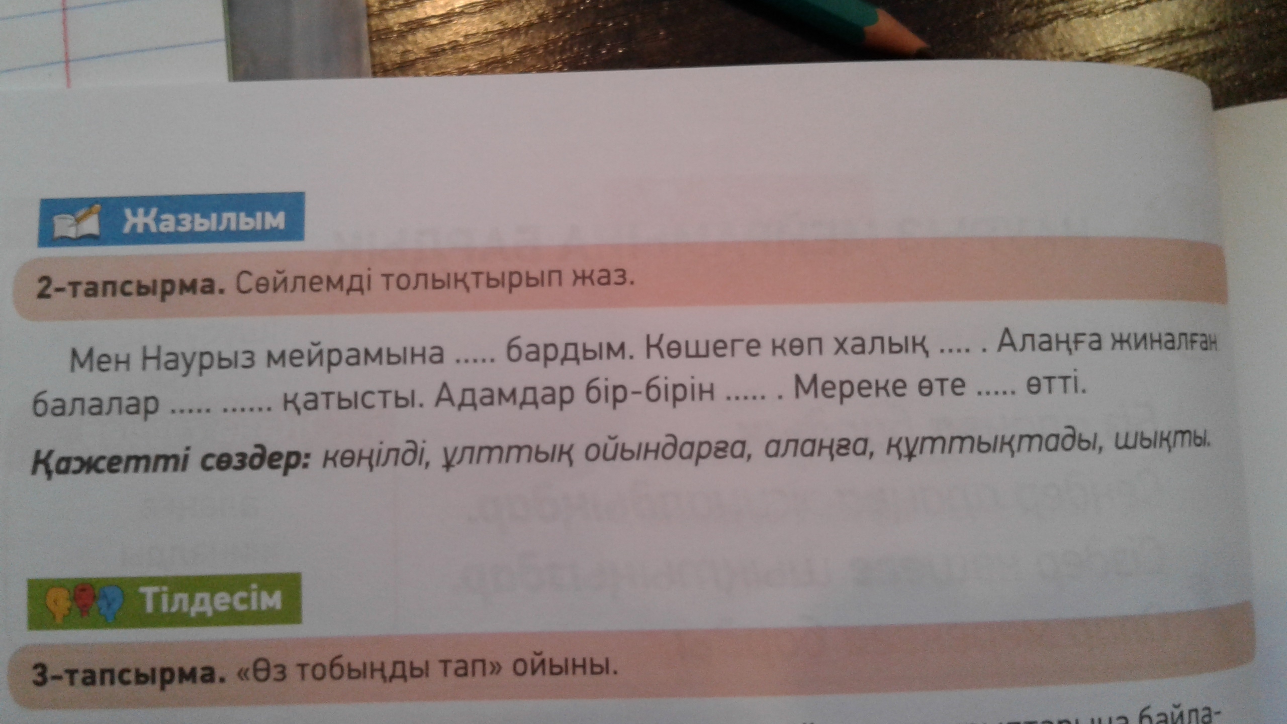 Мен Наурыз мейрамына алаңға бардым.Көшеге көп халық шықты.Алаңға жиналған балалар ұлттық ойындарға қатысты.Адамдар бір-бірін құттықтады.Мереке өте көңілді өтті.