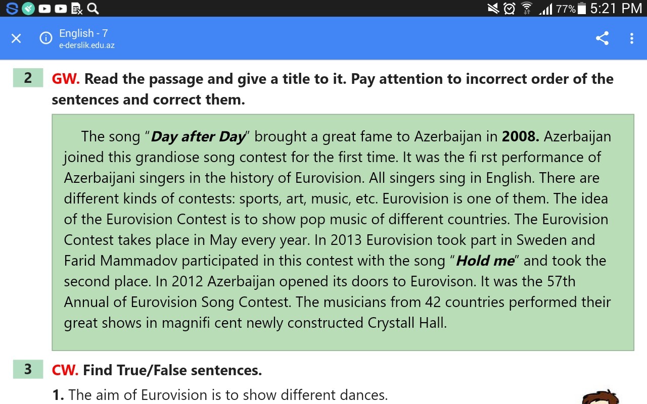 Пісня "День після дня" принесла велику популярність Азейбарджану в 2008 році. Азейбарджан подав цю грандіозну пісню на конкурс вперше. Це була найперша вистава азейбарджанських співаків в історії Євробачення. Всі співаки співали англійською. Там були різні куплети: спорт, арт та інші. Конкурс Євробачення один з них. Ідея конкурсу Євробачення показана в поп-музиці в різних країнах. Конкурс Євробачення проводиться в травні щорічно. В 2013 році Євробачення взяло участь в Швеції і Фарід Маммадов взяв участь в конкурсі з піснею "Тримай мене" і зайняв друге місце. В 2012 Азейбарджан відкрив свої двері в Євробачення. Це була 57 річниця Конкурсу Співаків Євробачення. Музиканти 42 країн представляють свої прекрасні виступи в чудовій новій будівлі Кристал Хол.