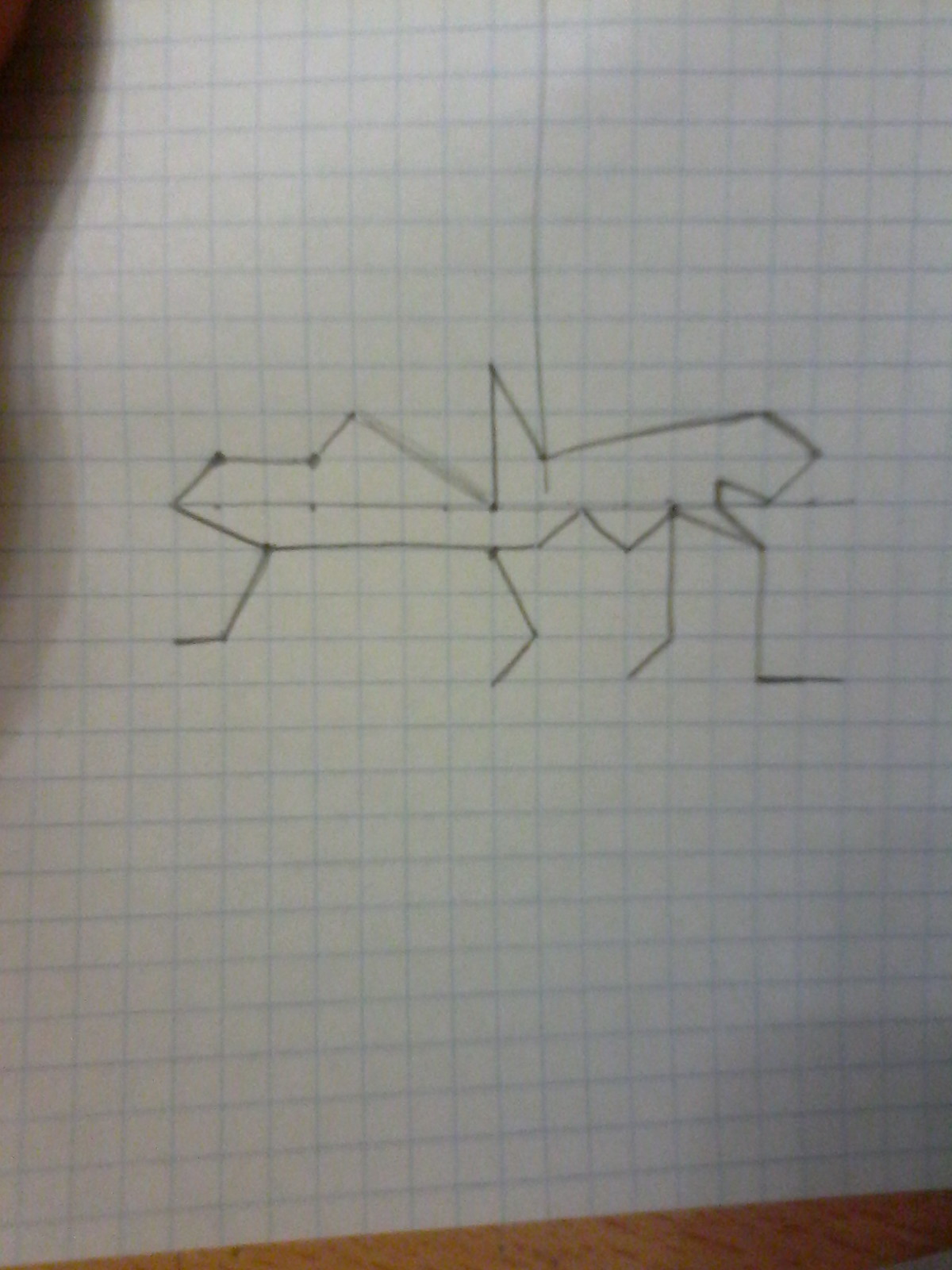 Тело: (-7;1), (-5;1), (-4;2) (-1;0),( -1;3) , (1;1), (5;2), (6;1 ) , ( 5;0), (4; 0,5), (4;0), (5;-1), (3;0), (2;-1) , (1;0), (0;-1), (-6;-1), (-8;0), (-7;1).