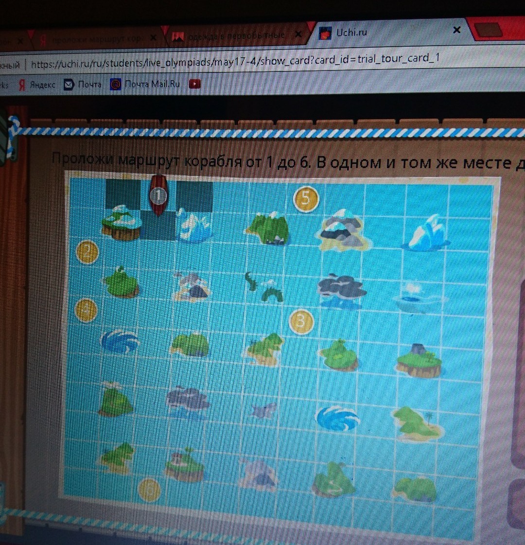 Помогите!!! Постройте маршрут от одного до шести не пропуская цифр и не проплывая на одноми том же месте дважды.