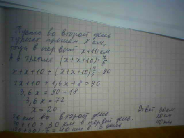 За 3 дня турист прошеел 90 км. Во второй день он прошел на 10 км меньше, чем в 1 день, а в 3 день 4/5 того, что он прошёл в 1 и во 2 день вместе. Сколько км проходил каждый день турист?