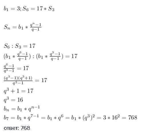 Первый член геометрической прогрессии равен 3. Сумма первых шести членов в 17 раз больше суммы первых трёх членов. Найти седьмой член прогрессии.