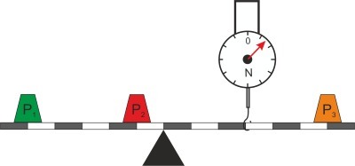 Дан невесомый рычаг, на одной стороне которого находятся два противовеса, вес которых равен P1=98Н и P2=72Н. На второй стороне рычага находится противовес P3=664Н и динамометр. Какую силу PД будет показывать динамометр, если рычаг находится в равновесии?