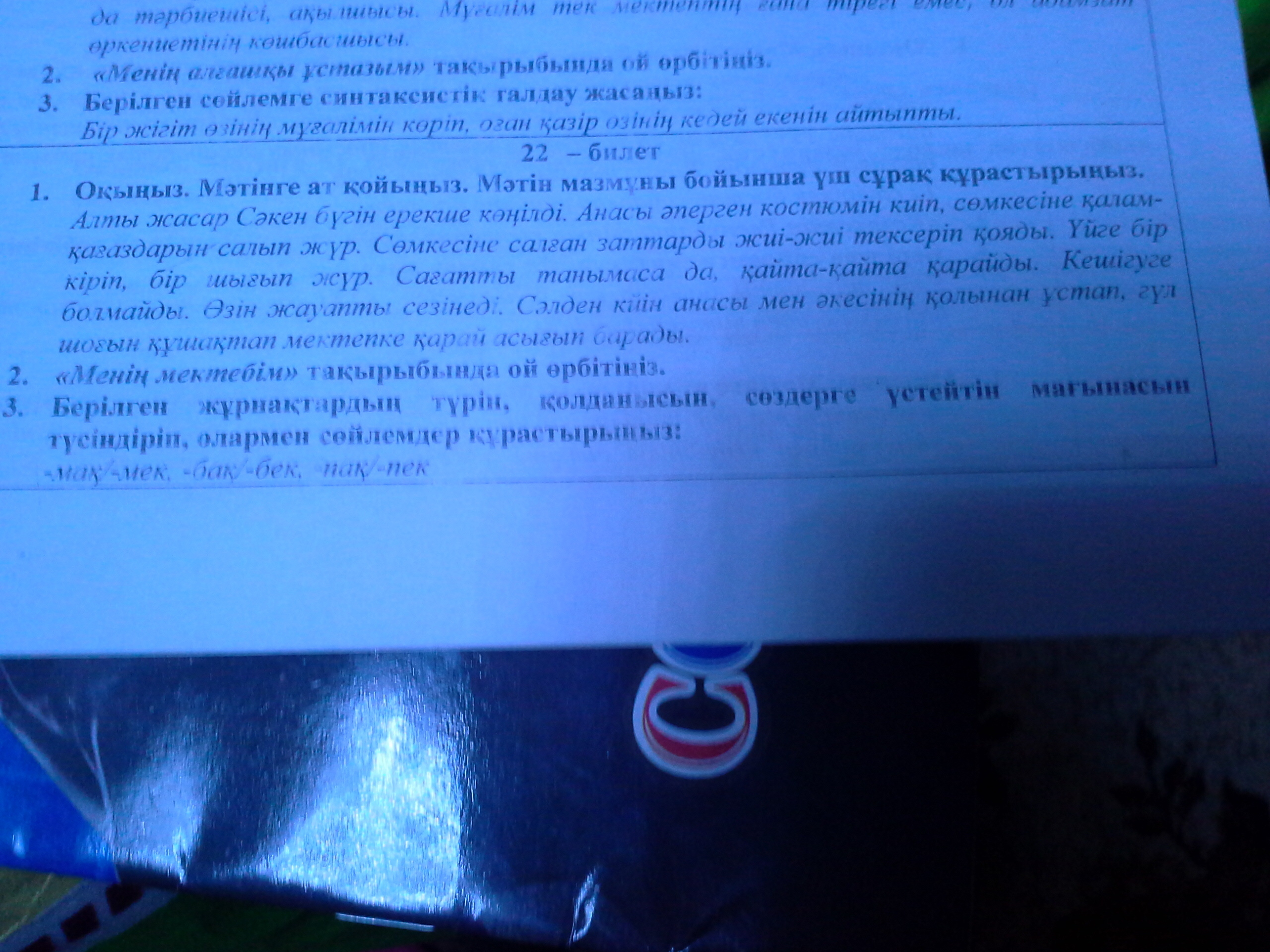 в 1 задании ты должен прочесть текст и составить по нему 3 вопроса 1 кім бүгін ерекше коңілді? 2 үйге не істейді? 3 не придумал в о втором задании тебе нужно написать пересказ про свою школу